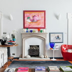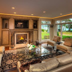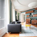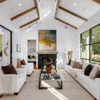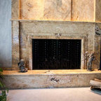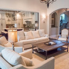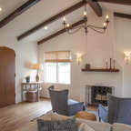 Inspiration pour un très grand salon méditerranéen avec un mur blanc, un sol en bois brun, une cheminée standard, un manteau de cheminée en carrelage et un sol marron. — Houzz
