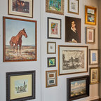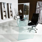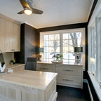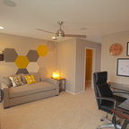 Cette photo montre un bureau tendance de taille moyenne avec un mur blanc, un sol en bois brun, aucune cheminée, un bureau indépendant et un sol marron. — Houzz