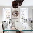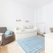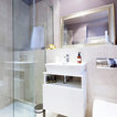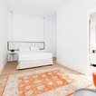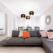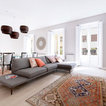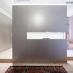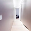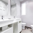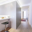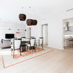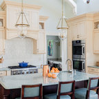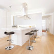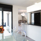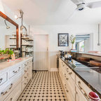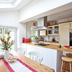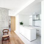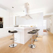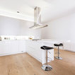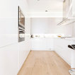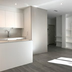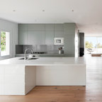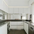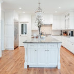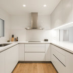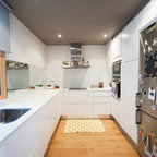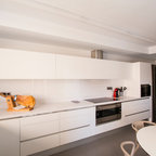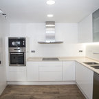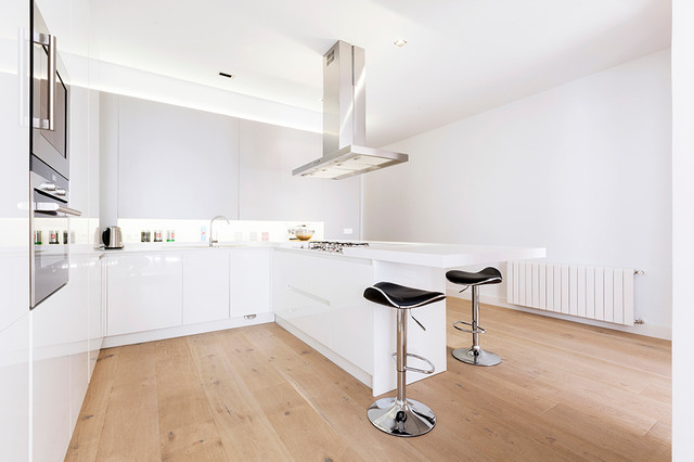 Exemple d'une cuisine tendance en L fermée et de taille moyenne avec un placard à porte plane, des portes de placard blanches, une crédence blanche, un électroménager en acier inoxydable et un sol en bois brun. — Houzz