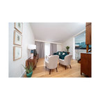 El verde petróleo combinado con textiles blancos y muebles de madera clara.