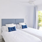 Cette photo montre une chambre parentale bord de mer avec un mur beige, un sol en bois brun et aucune cheminée. — Houzz