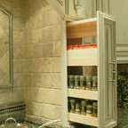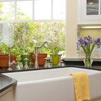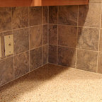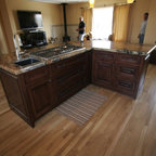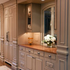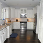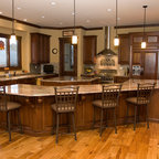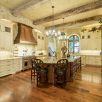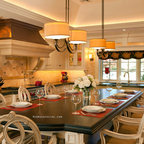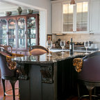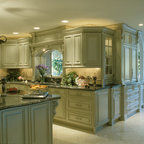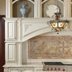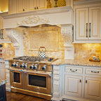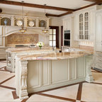 Réalisation d'une très grande cuisine américaine tradition en U avec un évier encastré, un placard avec porte à panneau surélevé, des portes de placard beiges, un plan de travail en granite, une crédence blanche, une crédence en carreau de céramique, un électroménager encastrable, un sol en carrelage de porcelaine et un îlot central. — Houzz