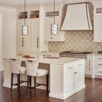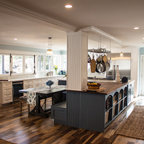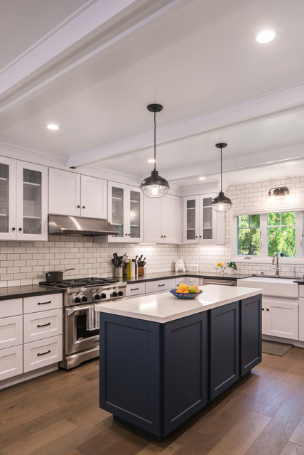 Exemple d'une très grande cuisine ouverte chic en U avec un évier de ferme, un placard à porte shaker, des portes de placard blanches, un plan de travail en quartz modifié, une crédence blanche, une crédence en carrelage métro, un électroménager en acier inoxydable, un sol en bois brun, un îlot central et un sol marron. — Houzz