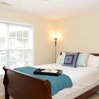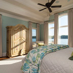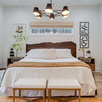 Cette photo montre une chambre parentale beige et taupe chic de taille moyenne avec un mur beige, un sol en bois clair, un sol beige et aucune cheminée. — Houzz