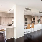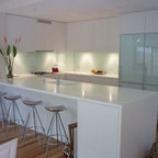 This works quite well with the light colours and a simple darker tone splash back and dark grey stools. Small amount of timber detail noted. Too much white?