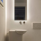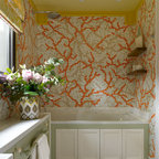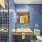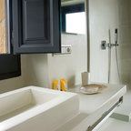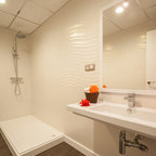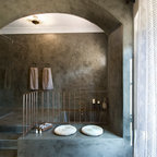 Exemple d'une grande douche en alcôve principale méditerranéenne avec une baignoire sur pieds, un carrelage blanc, un carrelage métro, un mur blanc, un sol en carrelage de céramique, un lavabo de ferme, un sol multicolore et une cabine de douche à porte battante. — Houzz