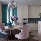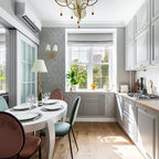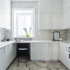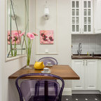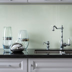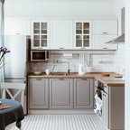 Idées déco pour une cuisine classique en L avec un évier de ferme, un placard avec porte à panneau encastré, des portes de placard blanches et une crédence grise. — Houzz