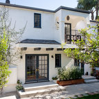 This is a Mediterranean style home in Glendale, CA. that we did an exterior remodel for. The arched windows, black wrought iron window boxes and clay tile roof complete the theme.