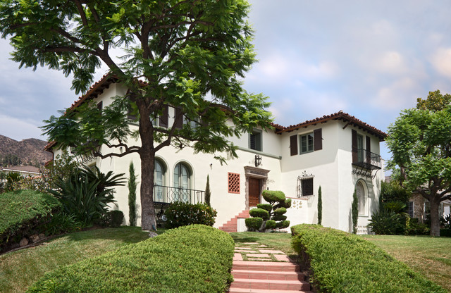 This is a Mediterranean style home in Glendale, CA. with an exterior remodel. The arched windows, black wrought iron window boxes and clay tile roof complete the theme.