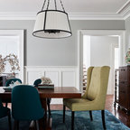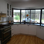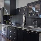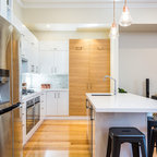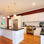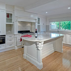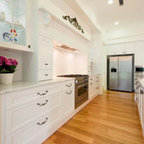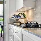 Idées déco pour une grande cuisine ouverte parallèle classique avec un évier 2 bacs, un placard à porte shaker, des portes de placard blanches, un plan de travail en quartz modifié, une crédence blanche, une crédence en carreau de céramique, un électroménager en acier inoxydable et un sol en bois foncé. — Houzz