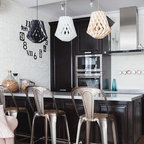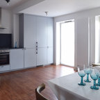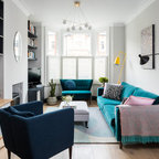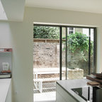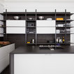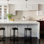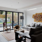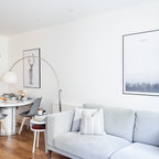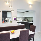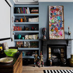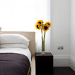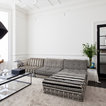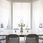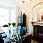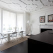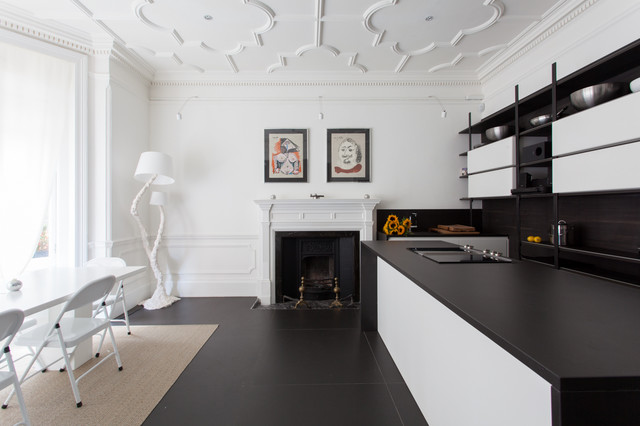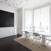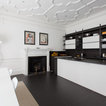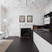 The kitchen/dining room is the heart and soul of this Mayfair apartment, with an amazingly detailed traditional ceiling and a stark modern kitchen design, the space demands presence. The white walls and black floors are a canvas for the owners extensive art collection, not taking any focus away from the huge light-flood windows and beautiful architectural detail throughout the building.