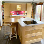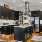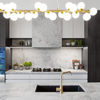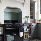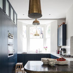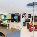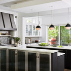 Cette photo montre une grande cuisine américaine moderne en L avec une crédence noire, un électroménager noir, un îlot central, un évier 2 bacs, un placard à porte plane, des portes de placard noires, un plan de travail en surface solide, une crédence en feuille de verre et béton au sol. — Houzz