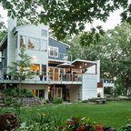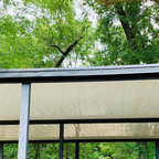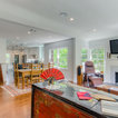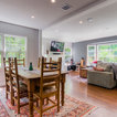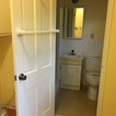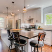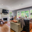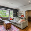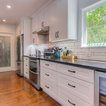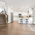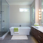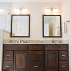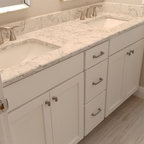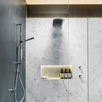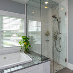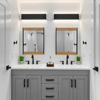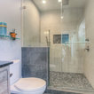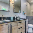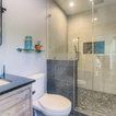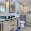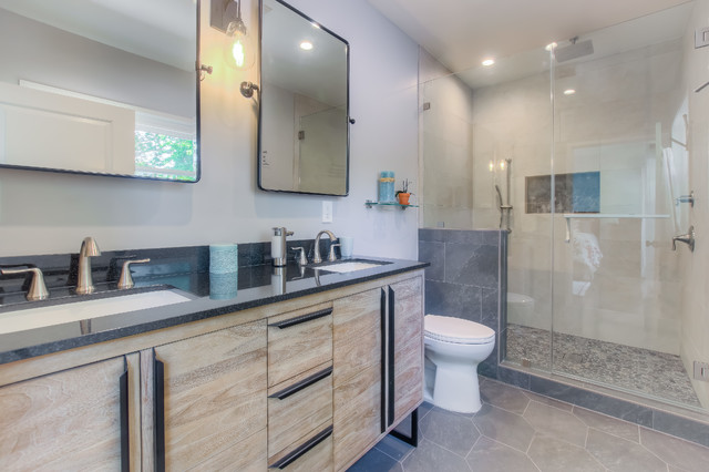 Amazing bathroom remodel featuring a Signature hardware double sink vanity with black quartz counters. large walking shower with bench and infinity square drain.