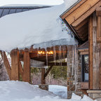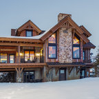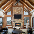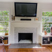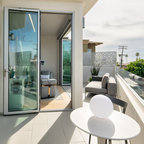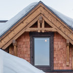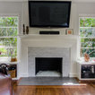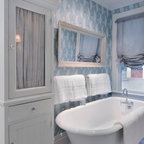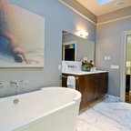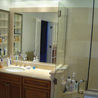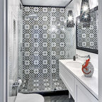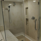 Angled hexagon Spanish Porcelain tiles on floors, and pebbles on shower pan floors.