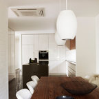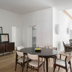 Cette photo montre une salle à manger ouverte sur le salon tendance de taille moyenne avec un mur blanc et un sol en bois foncé. — Houzz