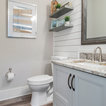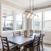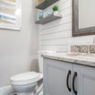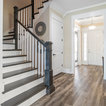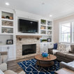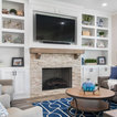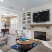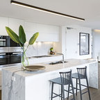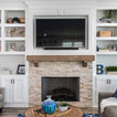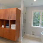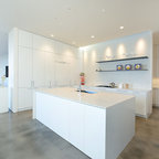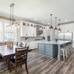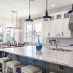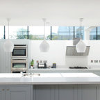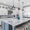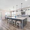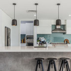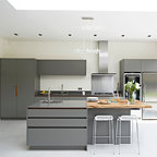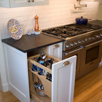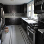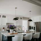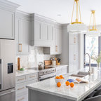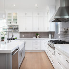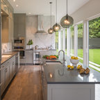 Aménagement d'une cuisine ouverte classique en L avec un évier encastré, un placard à porte shaker, des portes de placard blanches, une crédence grise, une crédence en carrelage métro, un électroménager en acier inoxydable, un îlot central et un sol marron. — Houzz