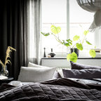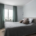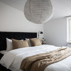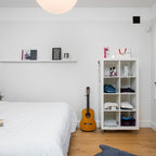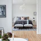 Idée de décoration pour une chambre d'amis nordique de taille moyenne avec un mur blanc et un sol en bois brun. — Houzz