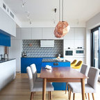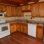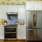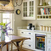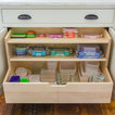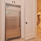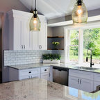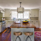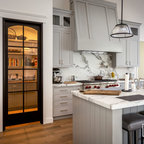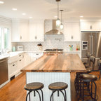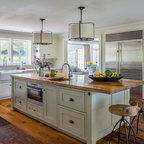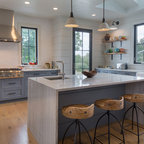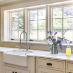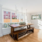 This modern farmhouse kitchen features reclaimed flooring and island countertop, farmhouse sink, marble countertops, Grabill custom cabinetry, with a unique drawer for tupperware and beautiful table with built in benches. Photography by Eric Roth