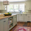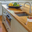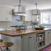island and having a different color on island plus wood top and 2 pendant lights plus lights on either side of sink attached to cabinet