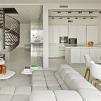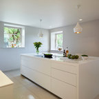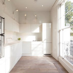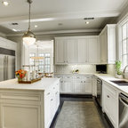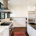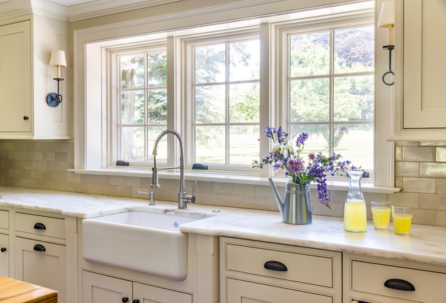 Exemple d'une grande cuisine américaine nature en L avec un évier de ferme, un placard avec porte à panneau encastré, des portes de placard blanches, un plan de travail en marbre, une crédence blanche, une crédence en carreau de céramique, un électroménager en acier inoxydable, un sol en bois brun et un îlot central. — Houzz
