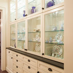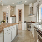 This modern farmhouse kitchen was created to match the style and feel of the rest of the historic house built in the 1700s. Reclaimed flooring and counters, white fully custom Grabill cabinets, a farmhouse sink, and marble counters complete this lovely kitchen. Design and Installation by Main Street at Botellos. Photography by Eric Roth.