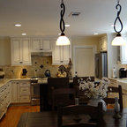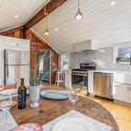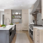 This modern farmhouse kitchen was created to match the style and feel of the rest of the historic house built in the 1700s. Reclaimed flooring and counters, white fully custom Grabill cabinets, a farmhouse sink, and marble counters complete this lovely kitchen. Design and Installation by Main Street at Botellos. Photography by Eric Roth.
