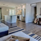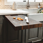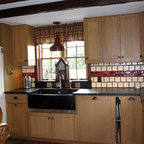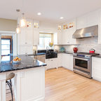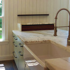 This modern farmhouse kitchen was created to match the style and feel of the rest of the historic house built in the 1700s. Reclaimed flooring and counters, white fully custom Grabill cabinets, a farmhouse sink, and marble counters complete this lovely kitchen. Design and Installation by Main Street at Botellos. Photography by Eric Roth.