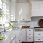 Cette image montre une grande cuisine américaine rustique en L avec un évier de ferme, un placard avec porte à panneau encastré, des portes de placard blanches, un plan de travail en marbre, une crédence blanche, une crédence en carreau de céramique, un électroménager en acier inoxydable, un sol en bois brun et un îlot central. — Houzz