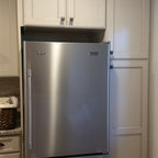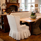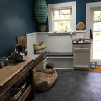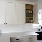 This modern farmhouse kitchen was created to match the style and feel of the rest of the historic house built in the 1700s. Reclaimed flooring and counters, white fully custom Grabill cabinets, a farmhouse sink, and marble counters complete this lovely kitchen. Design and Installation by Main Street at Botellos. Photography by Eric Roth.