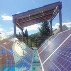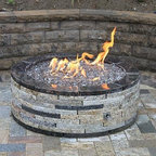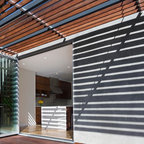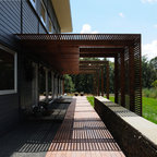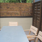 Idées déco pour une petite terrasse et balcon arrière contemporaine avec un foyer extérieur et une pergola. — Houzz