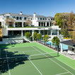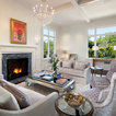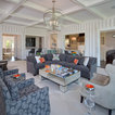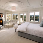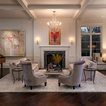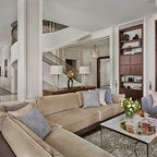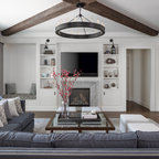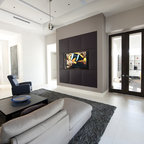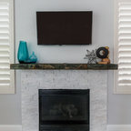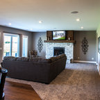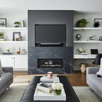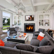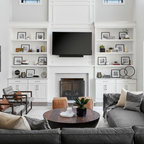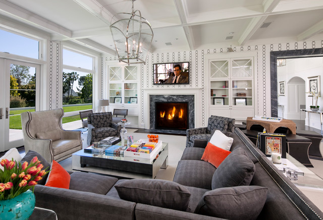 Cette photo montre une très grande salle de séjour chic fermée avec un mur blanc, une cheminée standard, un manteau de cheminée en pierre et un téléviseur fixé au mur. — Houzz