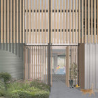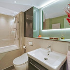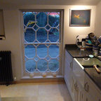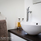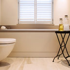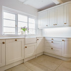 The kitchen is tucked into the furthest corner of the open-plan living area and the U-shaped layout is hardworking and practical, maximising workspace whilst allowing those in the kitchen to interact with others sitting in the dining area just beyond. The charcoal grey kitchen units reflect Houzz users’ appetites for dark kitchens: ‘blue kitchen’ and ‘black kitchen’ were frequent search terms in 2017, but green kitchens were a growing trend on Houzz last year - we reported on the trend back in January - so the introduction of an olive green wall against the black painted units neatly ties to two trends together.BeoSound shape, Bang & Olufsen. Sherwood Charcoal kitchen range, pewter knob and pewter cup handles, Apollo slab tech ice white worktop, Lincoln ceramic white undermount kitchen sink, Winnipeg kitchen tap, all Benchmarx Kitchens & Joinery. Ultimate one gang lightswitch, in gloss black, Schneider Electric. Wall colour, Gooseberry Fool, Dulux
