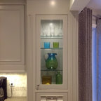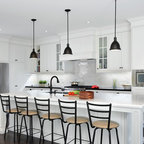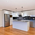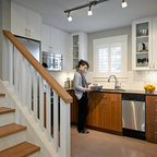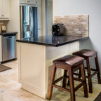 Cette image montre une cuisine américaine linéaire traditionnelle de taille moyenne avec un évier 2 bacs, un placard à porte shaker, des portes de placard blanches, un plan de travail en surface solide, un électroménager blanc, un sol en carrelage de porcelaine et un sol gris. — Houzz