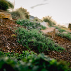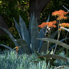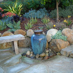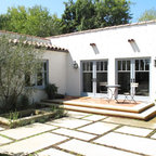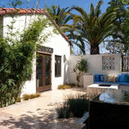 Cette image montre un xéropaysage avant méditerranéen de taille moyenne avec une entrée ou une allée de jardin, une exposition partiellement ombragée et des pavés en béton. — Houzz