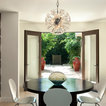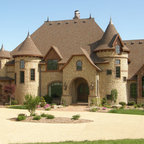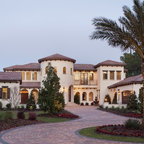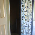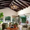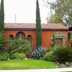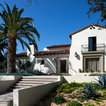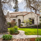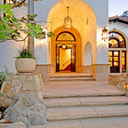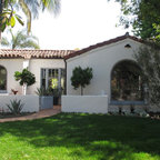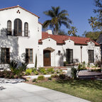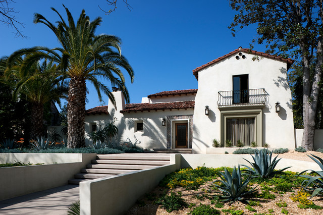 This recently remodeled two-story Los Angeles house has great curb appeal. The chimney on the left helps balance the two-level elevation on the right. Deeply inset, small stained glass windows flank the chimney, establishing solidity and strength. Colorful and intricate tiles announce a confident rectangular entrance, while a cast stone detail draws attention to the focal window on the right. Wrought iron light fixtures and a balcony railing above the window are other traits of Spanish eclectic style.