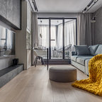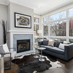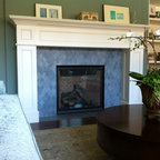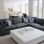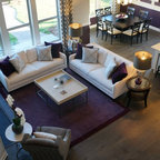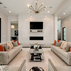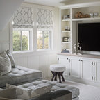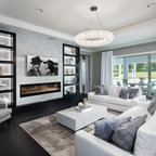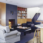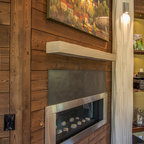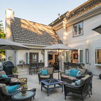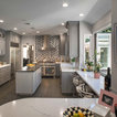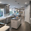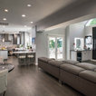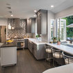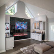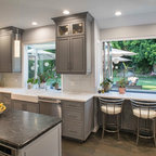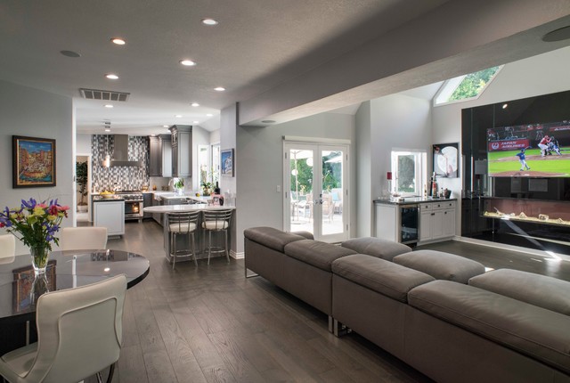 This is an extensive remodel done in Pasadena, CA. We created an entertainment center with a special ribbon fireplace directly below the large TV screen and fully remodeled the kitchen and family room. Special Cantina windows were installed in the kitchen and family room that open out into the patio for a wide, spacious feeling in the newly created indoor-outdoor space. One side of the kitchen has bar stools at a window counter that faces outside to show a view of greenery and trees in the yard.
