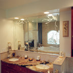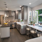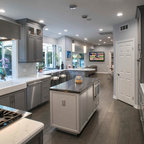 This is an extensive home remodel done in Pasadena, CA. We created an entertainment center with a special ribbon fireplace directly below the large TV screen and fully remodeled the kitchen and family room. Special Cantina windows were installed in the kitchen and family room that open out into the patio for a wide, spacious feeling in the newly created indoor-outdoor space. One side of the kitchen has bar stools at a window counter that faces outside to show a view of greenery and trees in the yard.