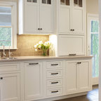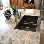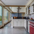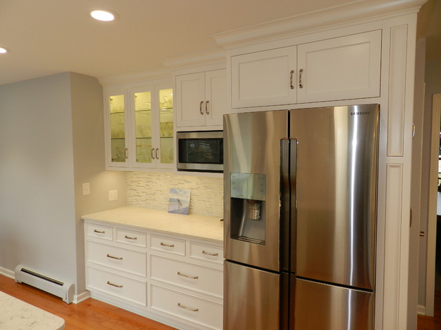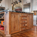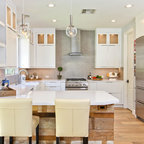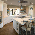 This extreme kitchen renovation involved removing many walls to create the open floorplan concept. The old laundry room was walled in approximately where the custom table sits now. A 12' custom patio door was added in place of a 6' window! Cabinetry was designed to precisely fit in this space using lots of drawer banks using no fillers. Shallow storage was built in to the right of the frig. and a 1200cfm hood vented through the roof was meticulously integrated above the slide in range. The laundry room is now hidden by a custom sliding barn door with soft close hardware. All this was done reusing the existing hardwood floors, patching in with new where required!