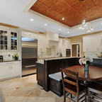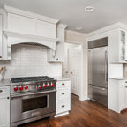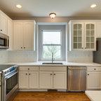 Idée de décoration pour une cuisine tradition en L avec un évier encastré, un placard à porte shaker, des portes de placard blanches, une crédence blanche, un électroménager en acier inoxydable et un sol en bois foncé. — Houzz