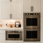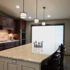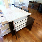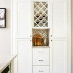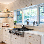 This remodel used a similar footprint but gained some great new use of the space. An overhang to the peninsula for seating, more functional cabinetry with drawer banks and trash pullout, and a custom coffee bar with a vintage window were the big gains in this space. Hardwoods throughout the kitchen and living room meet black and white hex tile in the back hall and powder bath.