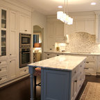 Réalisation d'une cuisine tradition en U fermée et de taille moyenne avec un évier 2 bacs, un placard avec porte à panneau encastré, des portes de placard grises, un plan de travail en quartz modifié, une crédence blanche, une crédence en carreau de céramique, un électroménager noir, un sol en bois brun, un sol marron et un plan de travail blanc. — Houzz