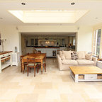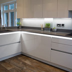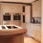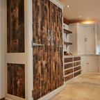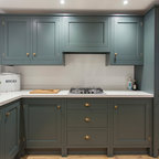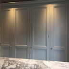 Cette image montre une arrière-cuisine traditionnelle avec un placard à porte shaker, des portes de placard grises et un sol en bois brun. — Houzz