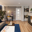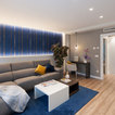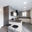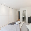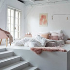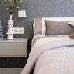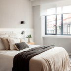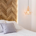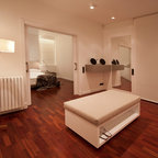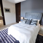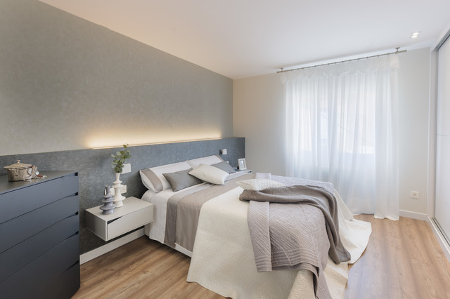 Idée de décoration pour une grande chambre design avec un mur gris, un sol en bois brun, aucune cheminée et un sol marron. — Houzz