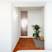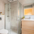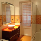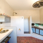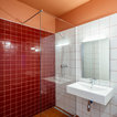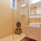 Idée de décoration pour une salle d'eau méditerranéenne avec un carrelage blanc, un carrelage rouge, un plan de toilette blanc, une douche d'angle, un mur orange, un lavabo suspendu, un sol orange et aucune cabine. — Houzz