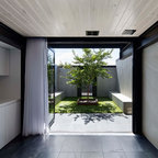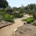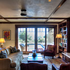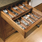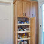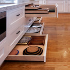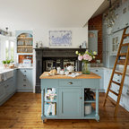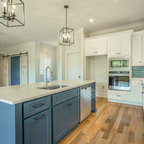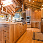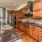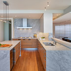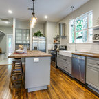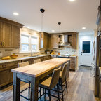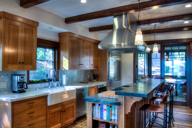 Aménagement d'une cuisine parallèle craftsman fermée et de taille moyenne avec un évier de ferme, un placard avec porte à panneau encastré, des portes de placard en bois brun, un plan de travail en marbre, un électroménager en acier inoxydable, un sol en bois brun et un îlot central. — Houzz