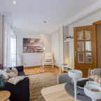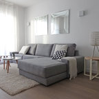 Idée de décoration pour un grand salon nordique ouvert avec une salle de réception, un mur marron, un sol en carrelage de céramique, aucune cheminée et aucun téléviseur. — Houzz