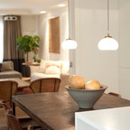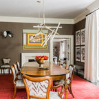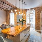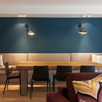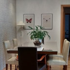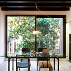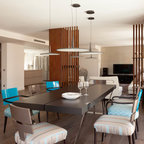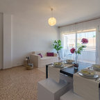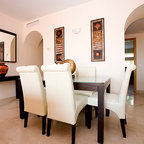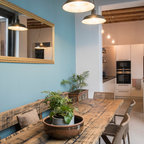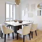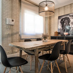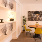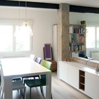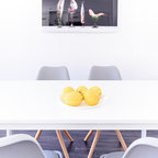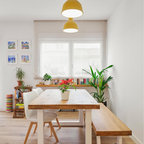 Cette photo montre une salle à manger ouverte sur la cuisine tendance de taille moyenne avec un mur blanc et aucune cheminée. — Houzz