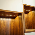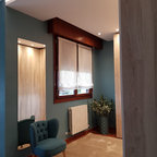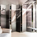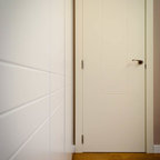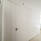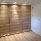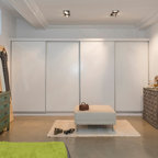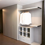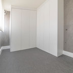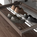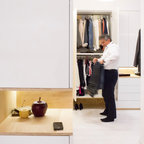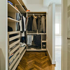 Cette image montre un dressing room design de taille moyenne pour un homme avec un placard à porte plane, un sol en carrelage de céramique et des portes de placard beiges. — Houzz