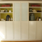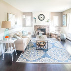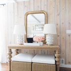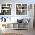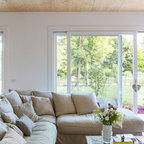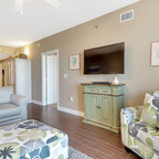 Cette photo montre un salon bord de mer fermé avec un mur beige, un sol en bois brun et un sol marron. — Houzz