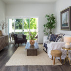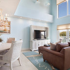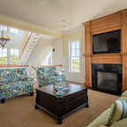 Exemple d'un grand salon bord de mer ouvert avec un mur beige, un sol en bois foncé, une cheminée standard, un manteau de cheminée en carrelage et un téléviseur fixé au mur. — Houzz